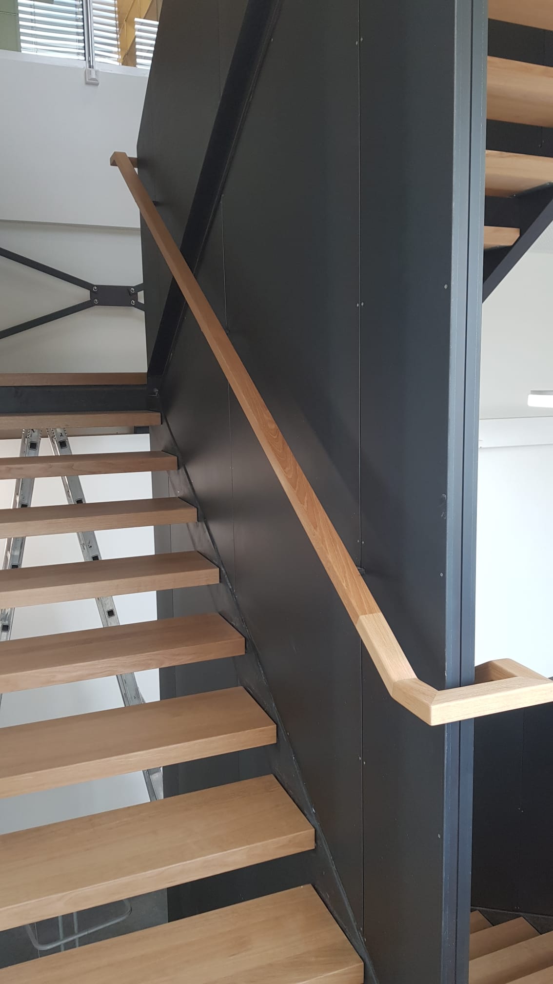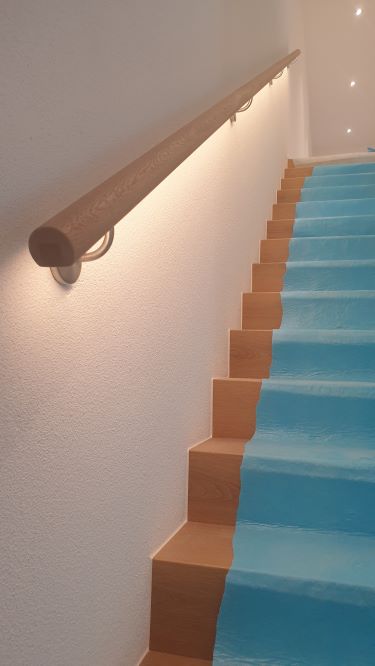 Nos clients sont des faiseurs : cette main courante en chêne de 50 mm avec rainure longitudinale a été spécialement fabriquée pour le système d’éclairage de main courante ELZA LED. Avec son éclairage raffiné, cette main courante est à la fois un élément de sécurité et un élément décoratif dans la cage d’escalier.