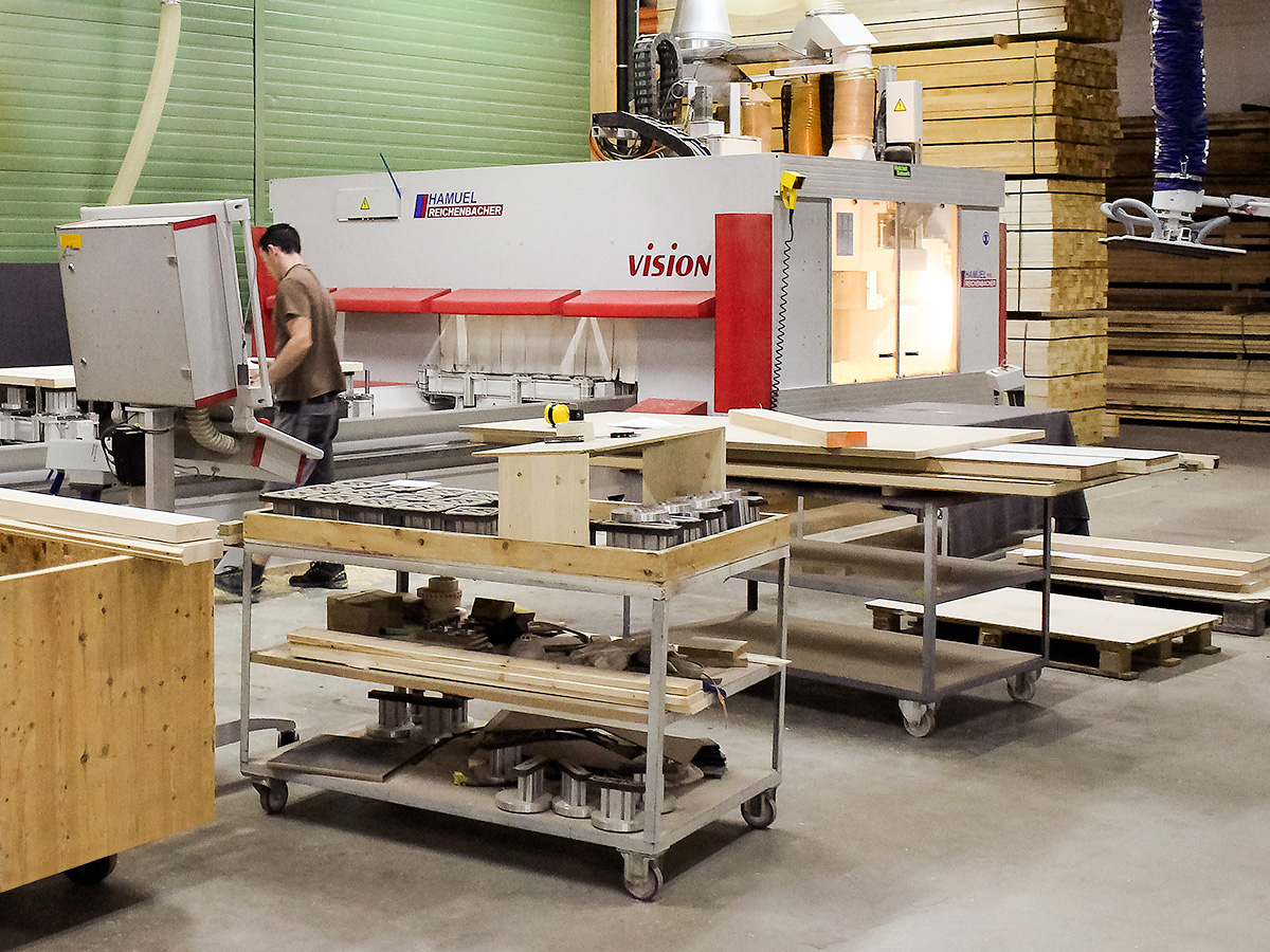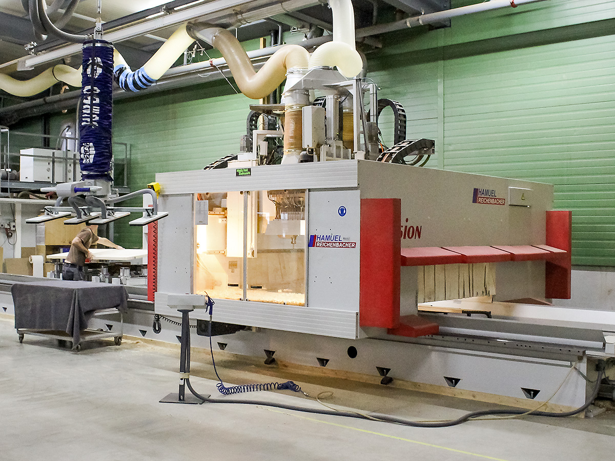 Das CNC-Bearbeitungscenter Reichenbacher Vision mit einer Bearbeitungsfläche von bis 6000 × 1300 × 300 mm, aufgeteilt in 2 Felder zur wechselseitigen Bearbeitung auf zwei Ebenen. Optimiert für die Türenproduktion und grössere Stückzahlen. Ausgerüstet mit einem 5-Achs- und einem 4-Achs-Kopf sowie einem Bohraggregat.
