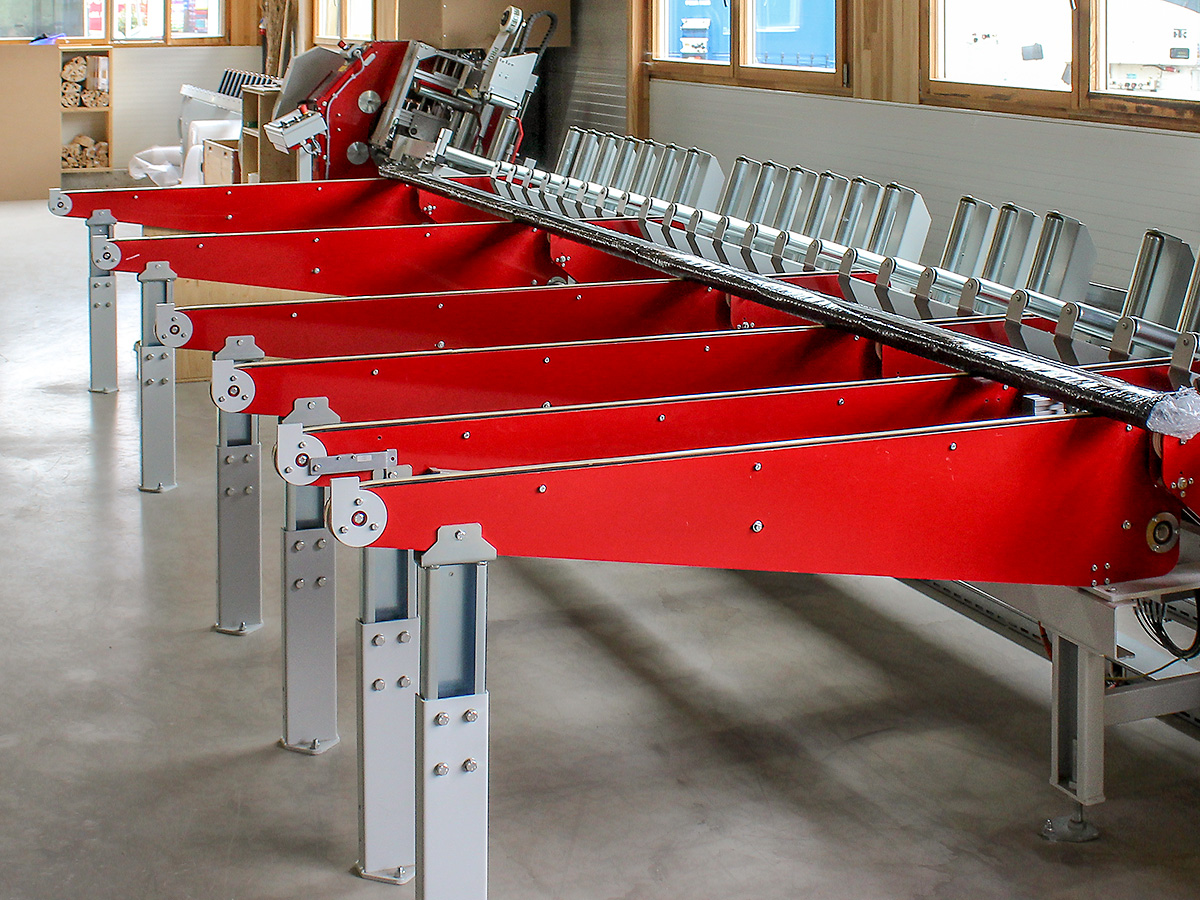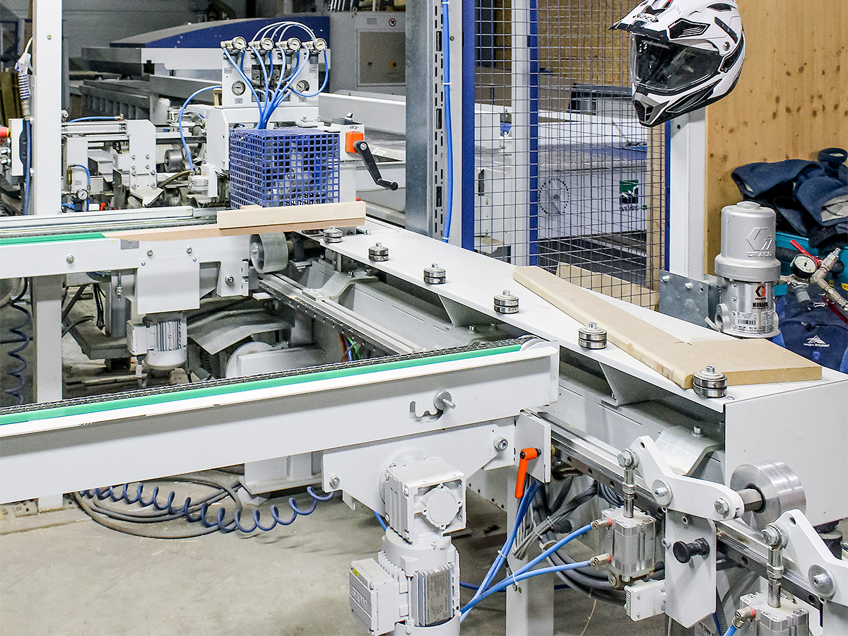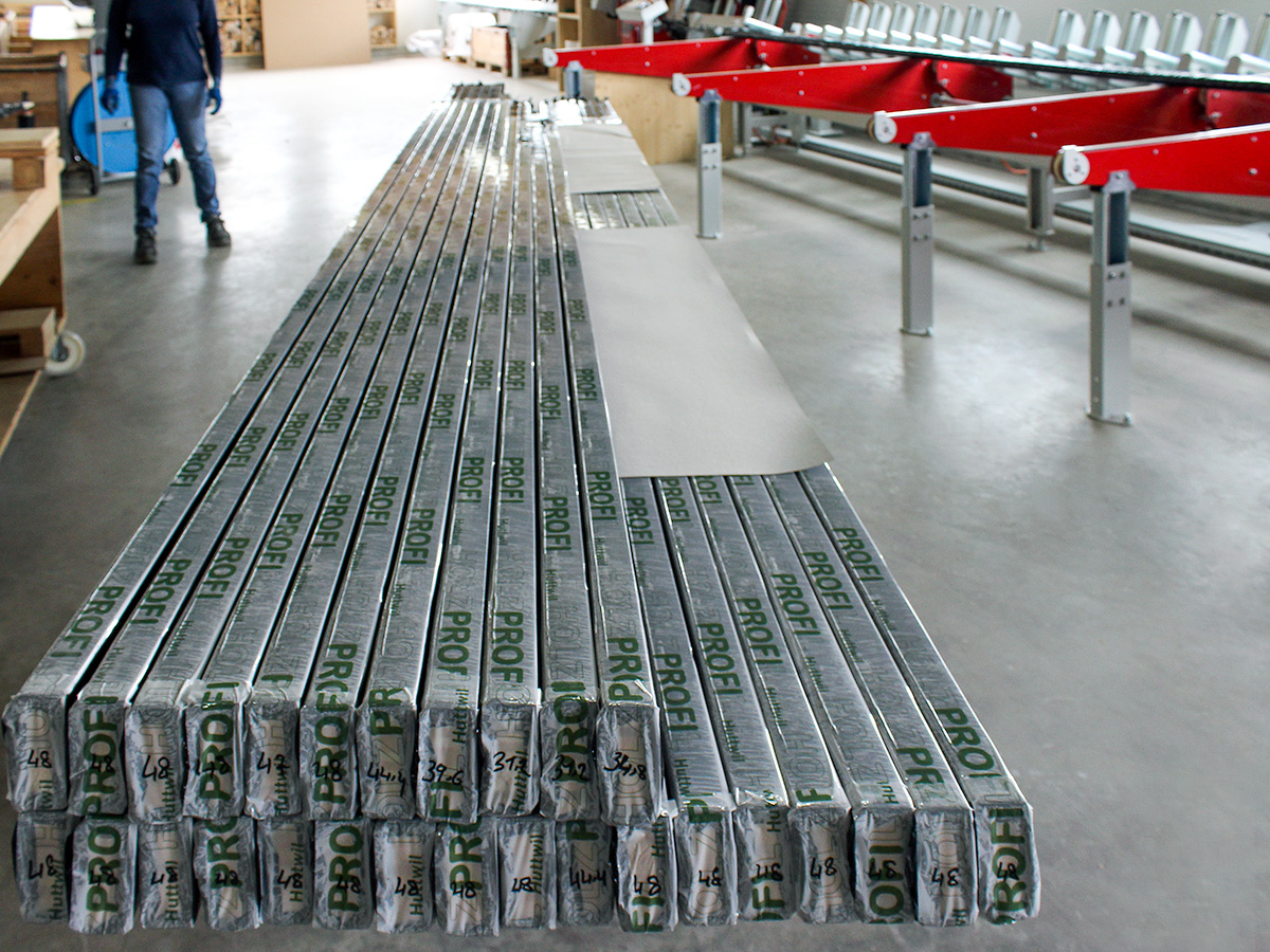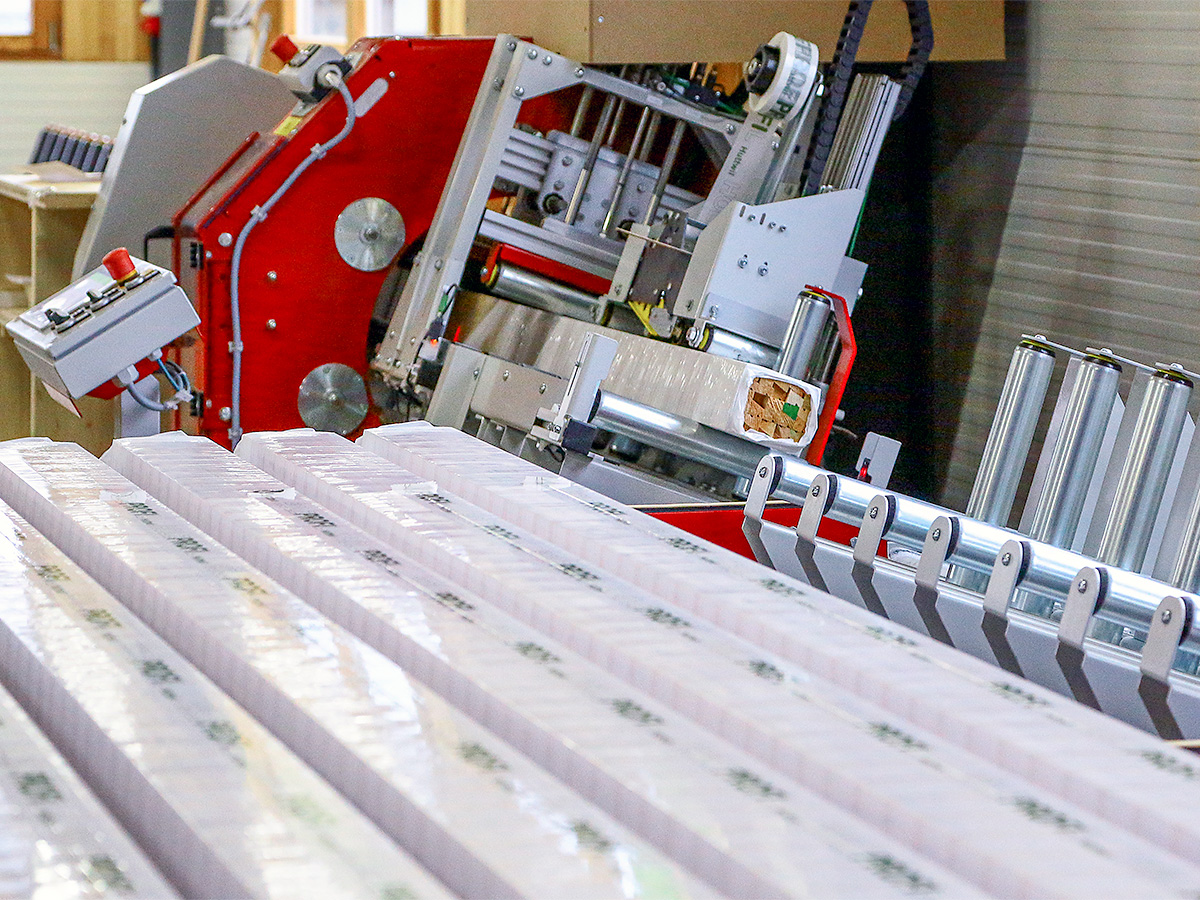 Die Leisten werden auf Ihre Qualität überprüft und sortiert, Fehler entsorgt oder ausgekappt. Anschliessend wird das Endprodukt transportfertig verpackt und der Spedition übergeben. Leisten werden mit einer speziellen Wickelanlage gebunden zwecks UV Schutz und Transportsicherheit. Mittels eines längsverlaufenden Klebebands wird das Verpackungsmaterial beim Aufschneiden zusammengehalten und lässt sich leicht entsorgen.