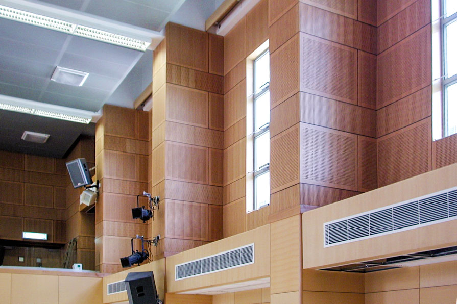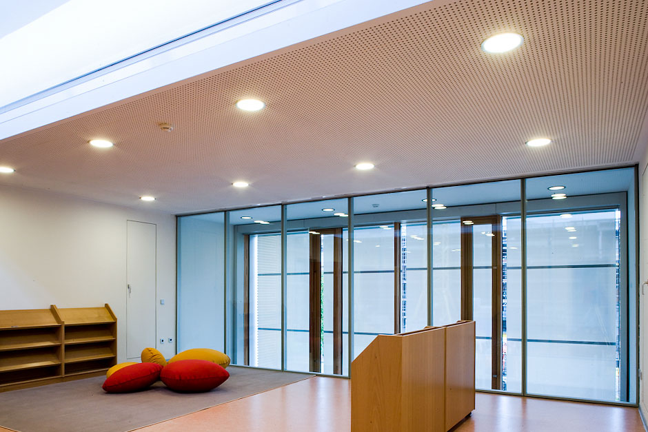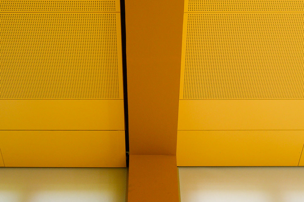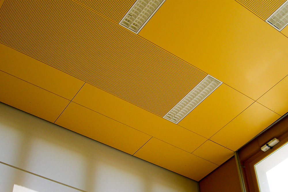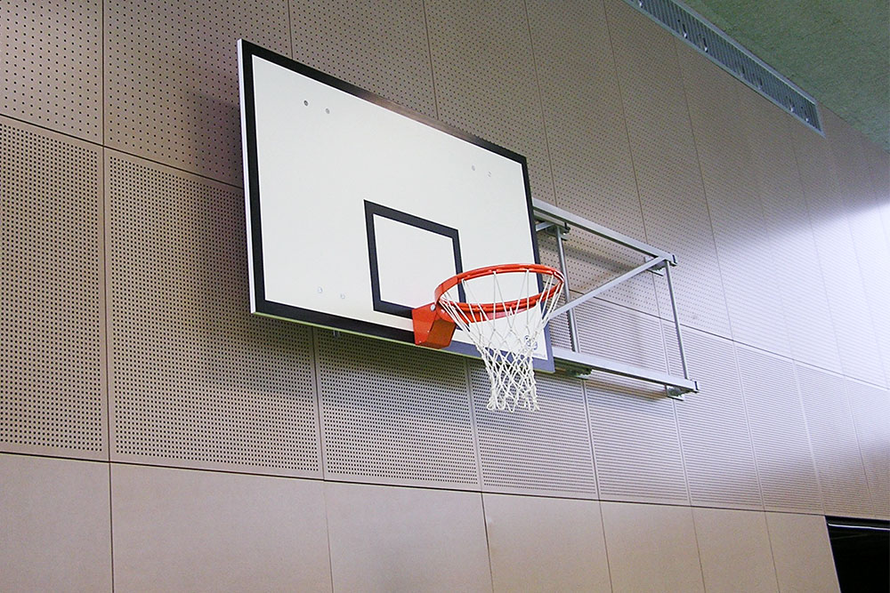 In Schwimmhallen als Akustikelemente sowie in Sporthallen als Prallwände mit Akustiklochung. - Wand- und Deckenverkleidung