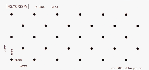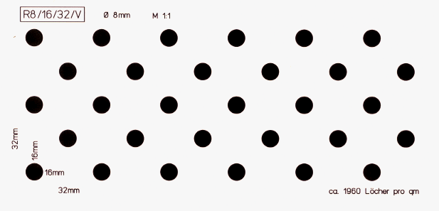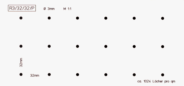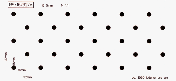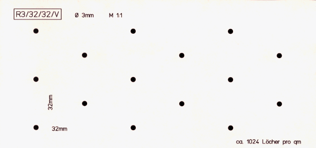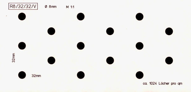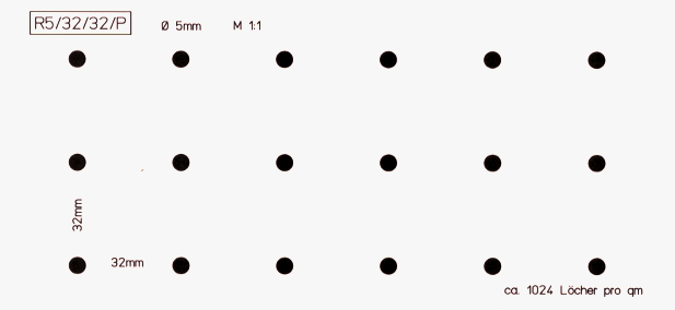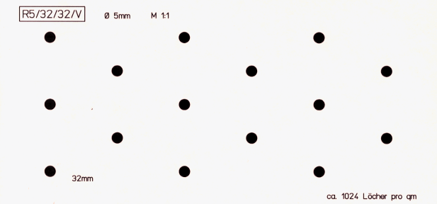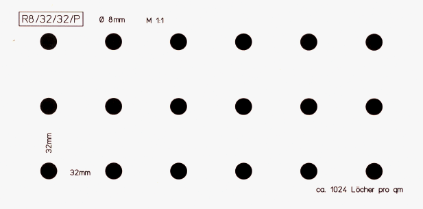 - Gebohrt wird im 16 und 32 mm Raster. Der Rasterabstand von 32 mm beruht auf den Normen der Möbelindustrie und des Innenausbaus. Bei Beschlägen und Dübelverbindungen ist dies ein Standartmass.