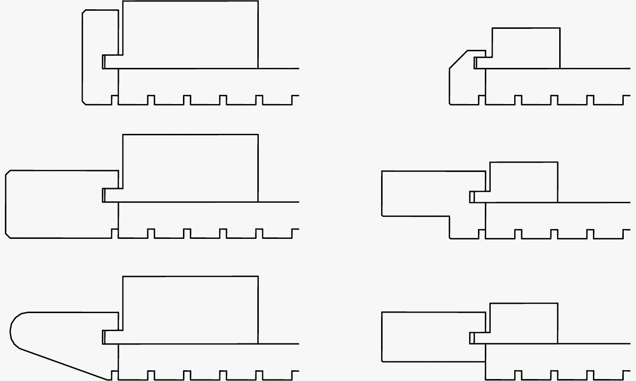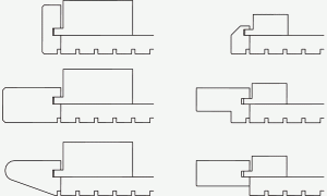 Die hintere Nutwange ist bei 16 mm Dicke = 5 mm, bei 17 mm = 6 mm usw. - Weitere Längskantendetails nach Absprache.