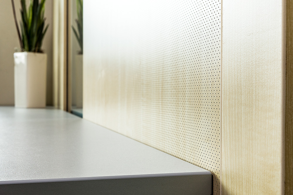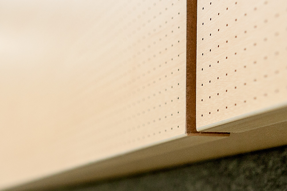 Die beidseitige, optisch ruhige Microlochung im Verbund mit der Holzfaserdämmung macht Akustitrenn zum idealen, gestaltbaren Material für den festen und mobilen Innenausbau, Messebau, etc.