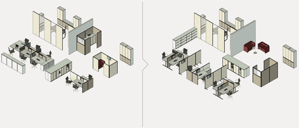 Neue Teams, neue Mitarbeiterstruktur, neue Raumnutzung? Mit den Akustitrenn System-Modulen passen Sie Ihre Arbeitsumgebung einfach an. Und das – wie hier im Beispiel gezeigt – ohne zusätzliche Kosten durch clevere Neukombination Ihrer vorhandenen Module und mit minimalem Aufwand.
