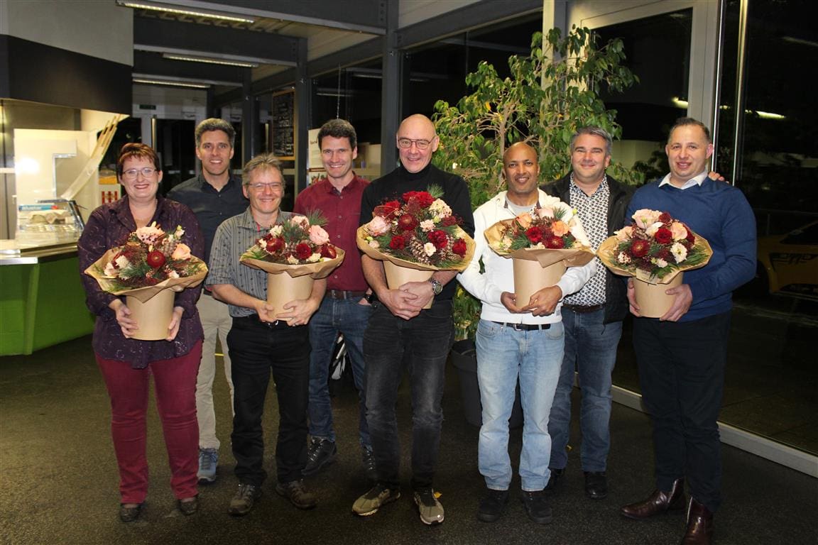 Auf dem Bild sind von links vorne: Verena Kojc 10 Jahre, Hans Siegenthaler 10 Jahre, Heinz Nyffenegger 30 Jahre , Mengsteab Gebrezgabiher 5 Jahre, Halil Velijaj 10 Jahre, von links hinten Christoph, Daniel und Thomas Ruch.